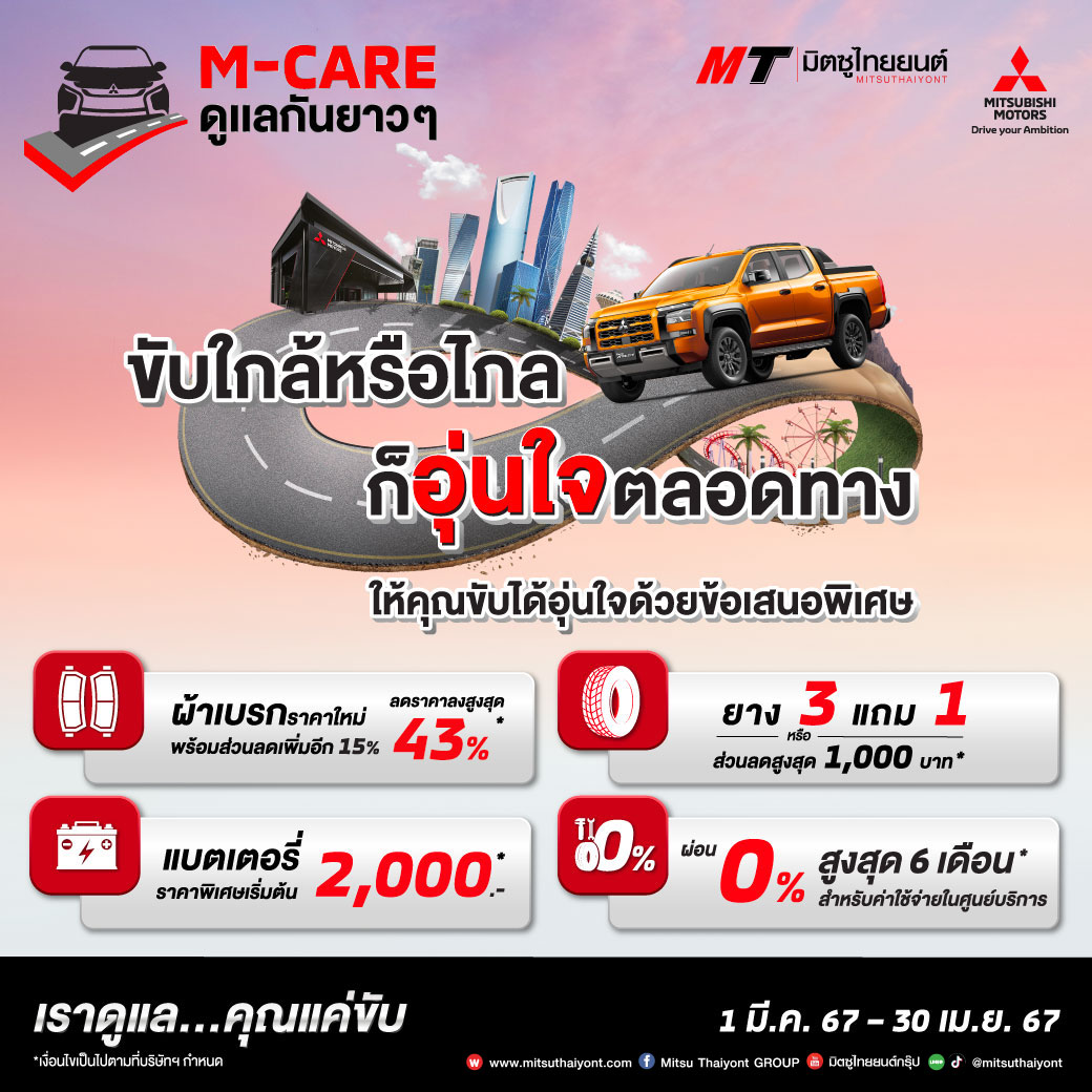 มิตซูบิชิ มอเตอร์ส มอบข้อเสนอพิเศษสุดคุ้ม เมื่อเข้ารับบริการหลังการขายที่ศูนย์บริการมิตซูไทยยนต์ทุกสาขา เจ้าของรถยนต์มิตซูบิชิ สามารถดาวน์โหลด แอปพลิเคชัน M-DRIVE และลงทะเบียนเพื่อรับสิทธิ์กับโปรแกรม M-CARE ยิ่งเช็กระยะต่อเนื่อง ยิ่งได้รับสิทธิพิเศษมากกว่า รับส่วนลดสูงสุด 15%*